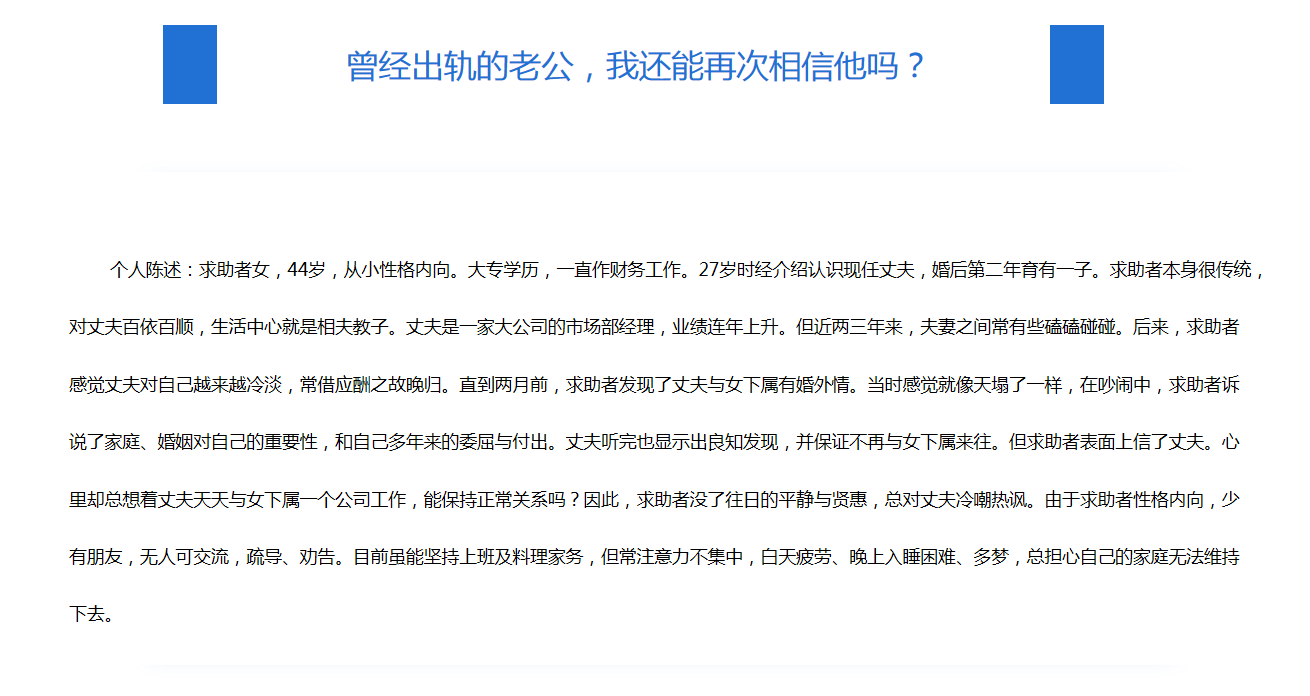 摘要:這(zhè)是一個由婚姻問題引起(qǐ)的一般心理問題的咨詢案例。求助者由于以前有過(guò)一次失敗的戀愛,所以自從結婚以後(hòu)就(jiù)非常珍重這(zhè)個家,加上丈夫精明強幹,所以她對(duì)丈夫十分依賴和順從,把家當成(chéng)了自己的最高精神寄托。但是由于性格原因,加上丈夫工作比較忙,夫妻間的交流與溝通越來越少。