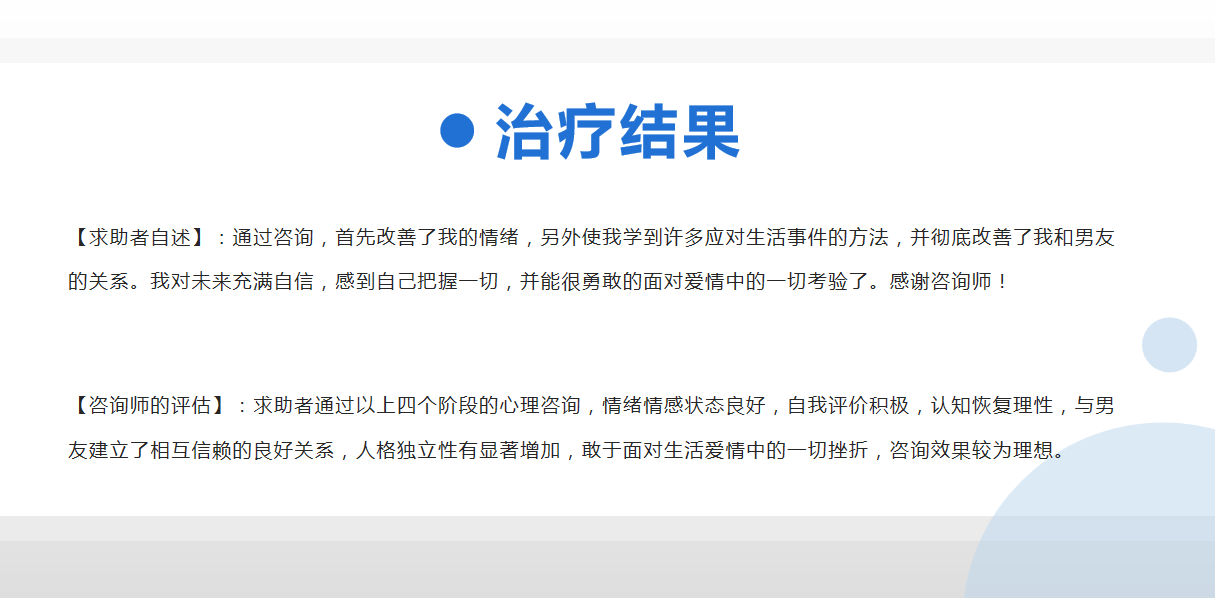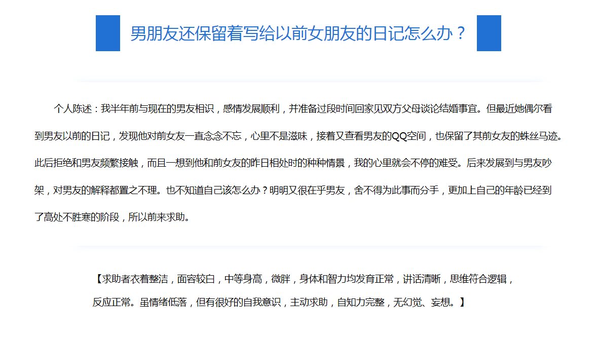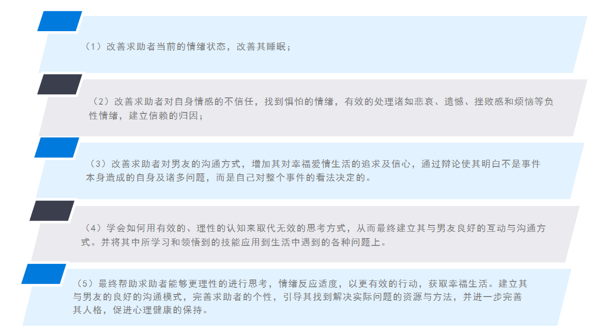 摘要:本文是一例運用埃利斯的合理情緒療法,對(duì)戀愛大齡女青年的情感問題進(jìn)行心理咨詢的案例報告。來訪者王某,女,32歲,俗稱的那一類“三高”未婚女青年,因爲3個月前最近發(fā)現男友保留著(zhe)以前寫給他前女友的日記而引發(fā)的一系列感情問題。同由于最近失眠,由于身心交互所導緻的矛盾沖突日益激化而前來咨詢。經(jīng)觀察與訪談後(hòu)診斷爲由感情問題引發(fā)的一般心理問題,根據來訪者的問題和年齡、文化水平等特點,采用認知學(xué)派中的合理情緒療法,後(hòu)經(jīng)過(guò)四次的心理咨詢,幫助她逐步的意識到是自己的一些不合理信念導緻了今天的問題,進(jìn)而通過(guò)改變其信念中不合理認知的方法,改善了與男友的關系,取得了較好(hǎo)的咨詢效果。