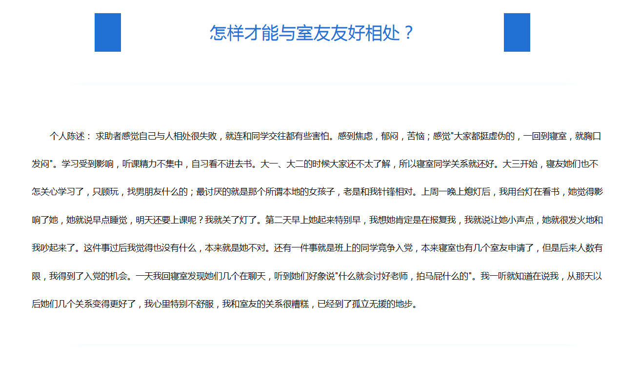 摘 要:大學(xué)生宿舍人際交往問題是當代大學(xué)生常見的心理問題。本案例求助者,在校大學(xué)生,因爲和同寝室同學(xué)鬧矛盾,感覺自己很無助,出現焦慮煩躁情緒,影響了其學(xué)習和生活,症狀持續時(shí)間短,診斷爲一般心理問題。咨詢師運用合理情緒療法和角色扮演進(jìn)行咨詢,取得了滿意效果。