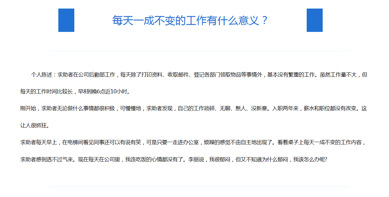 摘要:求助者公司同事(shì)友好(hǎo),工作任務不多,但是每天都(dōu)是一成(chéng)不變的工作内容讓求助者壓抑,找不到自我價值。