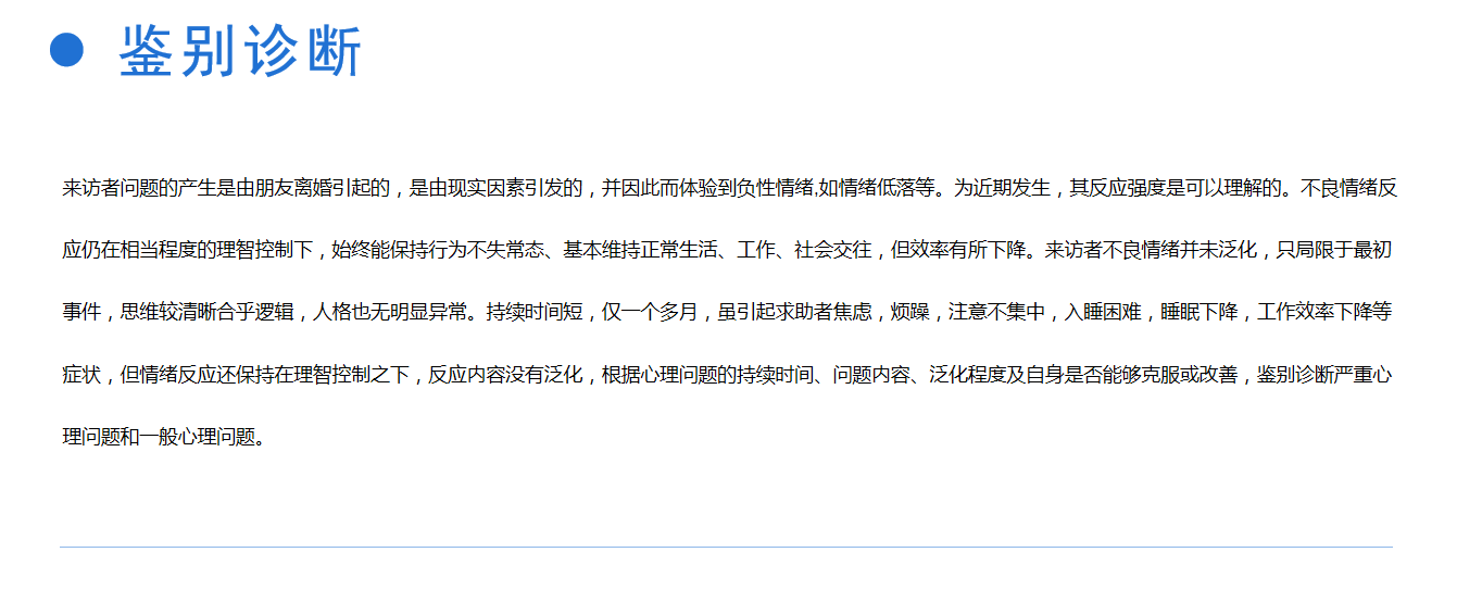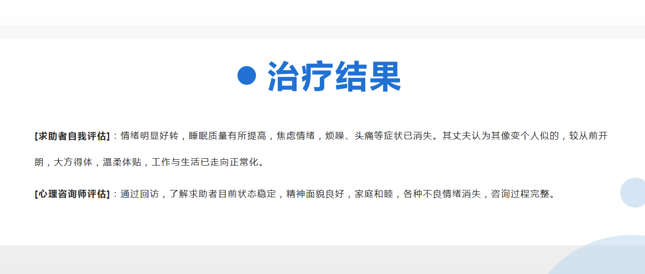 摘要:本案例介紹一位結婚多年婚姻未受到重大挫折,但最近看到一好(hǎo)友離婚,受其影響,對(duì)婚姻是否能(néng)長(cháng)久過(guò)分擔憂,并由此産生不良情緒進(jìn)而影響到工作和生活。經(jīng)診斷和分析,經(jīng)過(guò)4周治療,求助者認知方式有了明顯改變,進(jìn)入了正常的工作和生活。