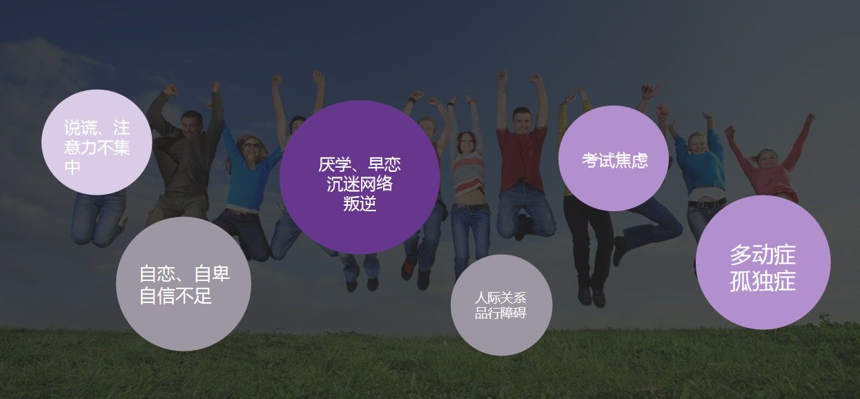 ★考試焦慮、網絡成(chéng)瘾、自閉症、多動症、早熟叛逆、适應障礙、語言發(fā)育遲緩;