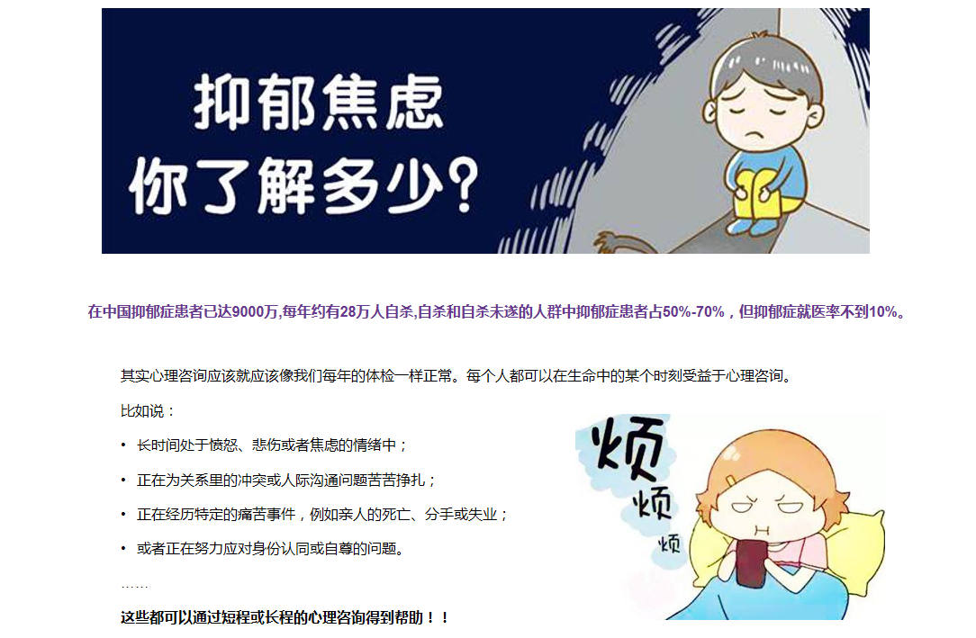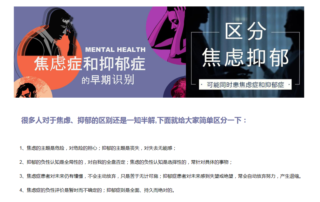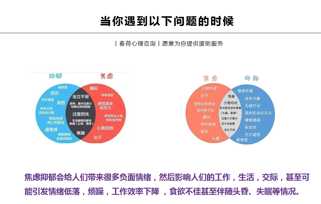 如果你經(jīng)常感到不愉快、不安和擔憂,害怕預期的未來事(shì)件,還(hái)可能(néng)表現出心慌、心悸、胸悶、乏力、出冷汗等一系列生理紊亂症狀,以及易怒、緊張等心理症狀。抑郁主要表現爲情緒低落,悶悶不樂,無愉快感,興趣減退,伴有自我評價低,無價值感,自責等。聯系我們,獲得專業的幫助!